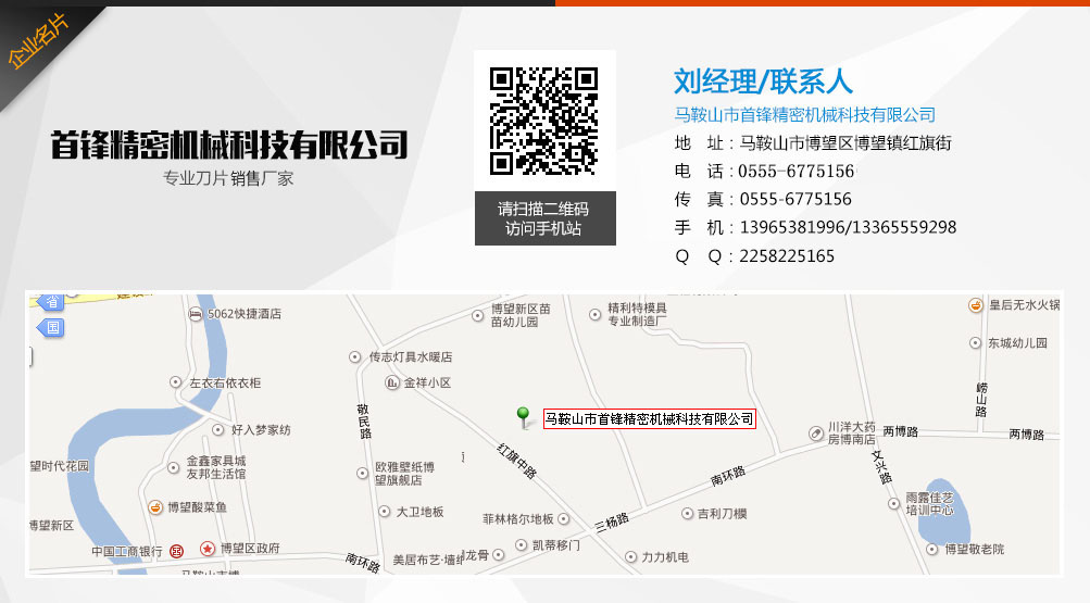 馬鞍山市首鋒精密機械科技有限公司位于中國之鄉馬鞍山市博望區博望鎮紅旗街。地理環境優越,交通便利。工業區內314省道貫穿,連接江、浙、滬、皖,距南京祿口國際機場30公里。   我們專業研發銷售各種機械圓刀、長刀、分切刀片、沖剪刀、剪板機刀片、等沖壓剪切刀具機械配件。產品廣泛應用于冶金、造紙、紙品加工、印刷、橡膠工業、塑料、木材加工、食品、金屬加工、皮革、無紡布、不干膠、膠帶、板材加工、軋鋼、紡織、五金機械等行業。   馬鞍山市首鋒精密機械科技有限公司,機械刀片加工歷史悠久,具有豐富的切削刀具加工經驗,擁有多條國內先進的研發設備和一套科學加工工藝,在保證了產品質量和品質的同時,使產品生產做到了程序化和規模化。   我們本著“誠信、求精、高效”的精神,期待著與國內外各界開展更為廣泛的交流與合作!